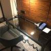 バスルームはこんな感じ。シャワーやトイレも全面ガラス張りですが、バスルームと隣接する部屋(ベッドルーム)の間に扉はあるので目隠し可能です。窓ガラスも電動ブラインドがあります。シャンプー等は、スイートルーム限定でブルガリのものが置いていました(スイートルーム以外ではホテルオリジナルのものが置かれている)。